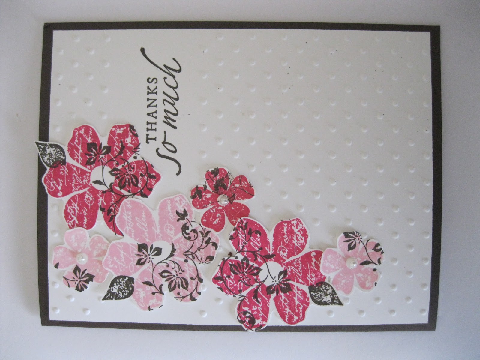 | Masking + Sponging! I had forgotten about this very simple but beautiful technique; it was fun to bring it out again. My colors here are Pink Pirouette and Rich Razzleberry. Believe it or not, this is a fairly quick card to make, and requires relatively few supplies : ). Nice! |